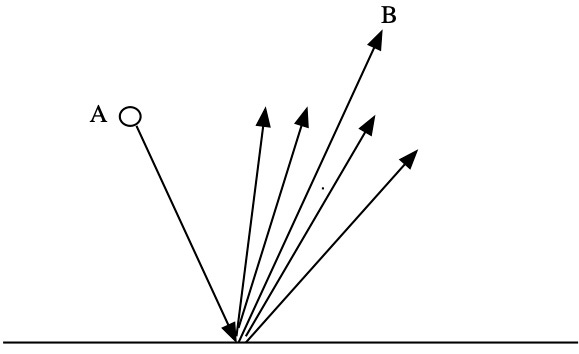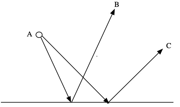 This should not lead you to conclude that light emerging from some source only follows one path, or there is only one ray. There are in fact an infinite number of rays leaving any source. But only one will reach a second point, which might be the position of your eye or a detector. In the diagram below several rays of light leave the source A, but only one of them both reflects off the mirror and reaches point B. That ray has followed two straight lines and the angle that the incident ray (A to mirror) makes with the mirror is the same angle made by the reflected ray (mirror to B). By convention the angles are measured relative to a line drawn perpendicular to the mirror surface, but the principle is the same. Other rays are incident on the mirror at different angles and reach other points, C for example in the diagram. And the incident and reflected angles in these cases are also equal.